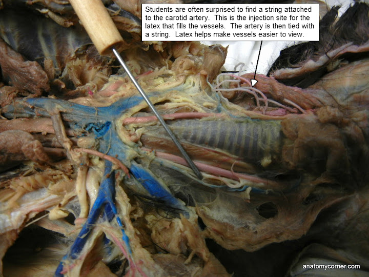 If your cat has been injected, then you may see an incision and a string attached to the neck area. This is the point where the colored latex was injected into the cat to fill the veins and arteries. The process makes it easier to identify arteries, which will be colored pink, and veins which will be colored blue. Without the injection, the vessels all have the same brownish, gray color.